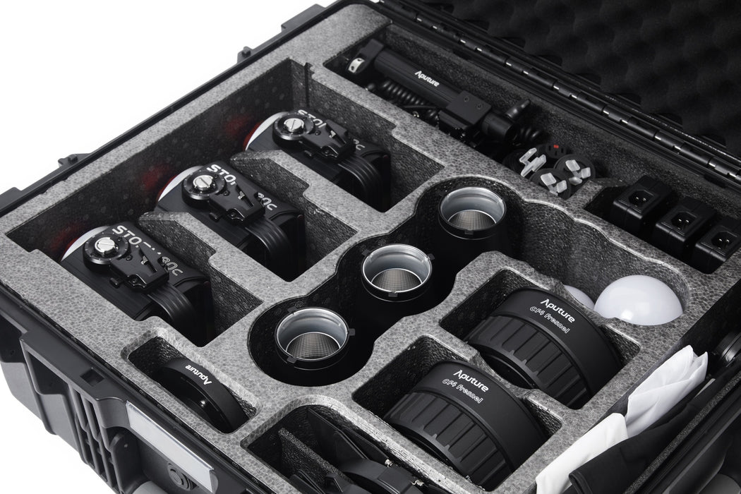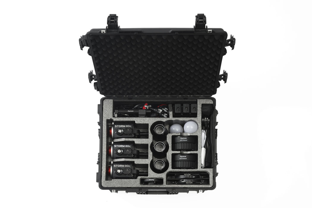 Portable 3-Light Kit of Aputure STORM 80c Lights Complete With Modifiers, Power, and Mounting Accessories, Packed in a Protective Rolling Hard Case: