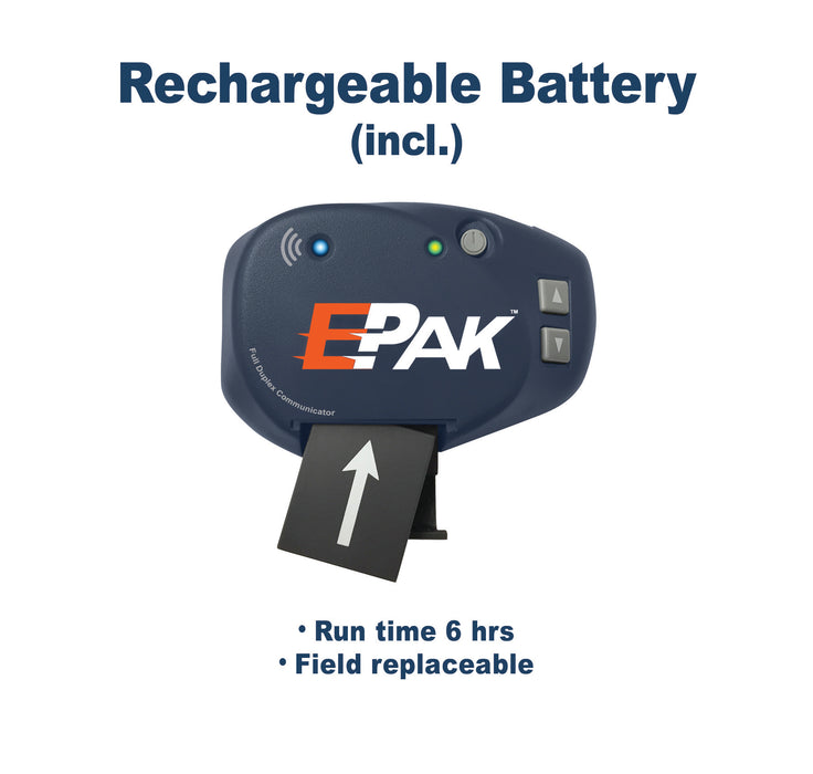Operation of the E-Pak system is as simple as installing charged batteries (included, w/ charger). When the transceivers are turned “ON” they link automatically without tuning or programming. Transmitting range is up to 300 yards, and an unlimited number of E-Pak systems can operate in the same venue free of crosstalk or interference. The Lithium-Ion batteries are charged externally and field replaceable which makes E-Pak the perfect wireless for shows or competitions where the system needs to operate over the standard six hour run time.