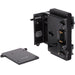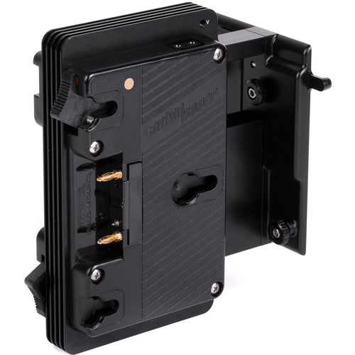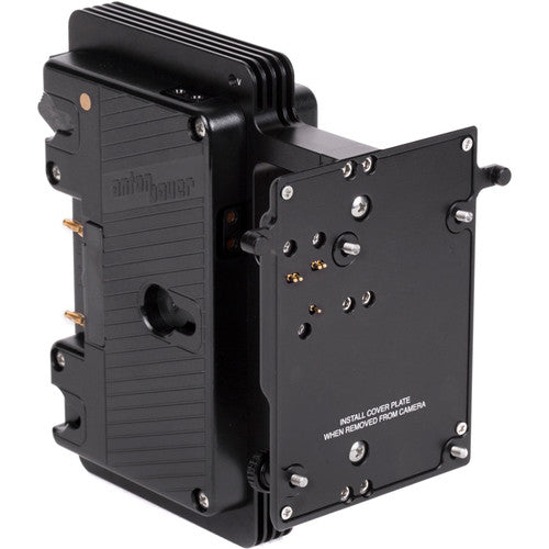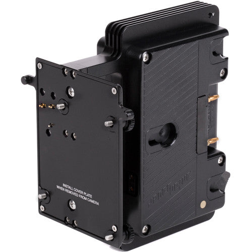 ARRI Alexa LF 24V Sharkfin Battery Bracket (Gold Mount) allows for two standard voltage gold mount batteries to power the Alexa LF, which requires 24V. Key features include hot swapping capability between batteries and the DC input, 4x D-Tap connectors that remain powered with at least one battery installed, percentage information transmitted to the camera when smart batteries are used, knobs for tool-less installation with a hidden allen wrench for additional tightening, and a protective cover plate for when battery bracket is not in use.